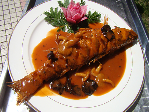 原料:梭罗鱼。配料:葱、姜、白糖、醋、豆瓣酱、食用盐、食用油、淀粉。制法:洗净后将鱼两侧改成十字刀,铺淀粉过油,捞出鱼控油。锅底留少许油,炒辅料,加水放入白糖,将鱼放入锅内,炖时间稍长。特点:香嫩可口