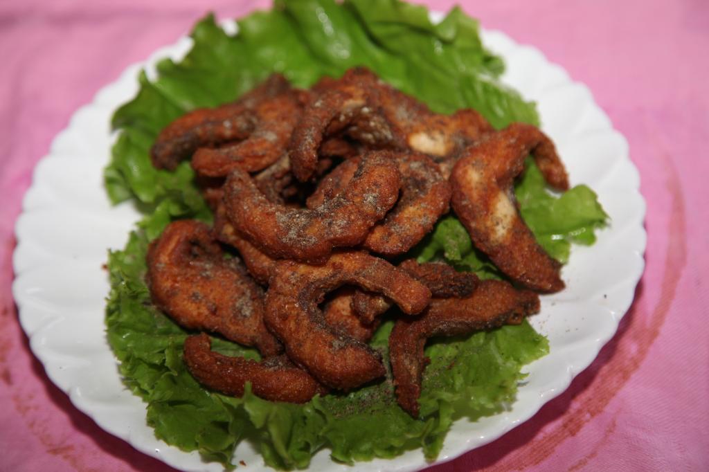 原料:虹鳟。配料:美极鲜、酱油、鸡蛋、面粉、食用盐、生姜末、葱末。制法:洗净后鱼剁成条放入鸡蛋、面粉、食用盐、生姜末、葱末腌制,腌6-7分钟后炸制,撒上孜然粉、椒粉。特点:营养丰富,美味可口,方便食用。