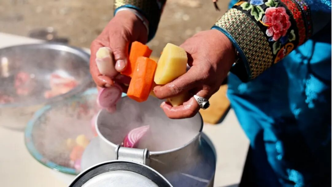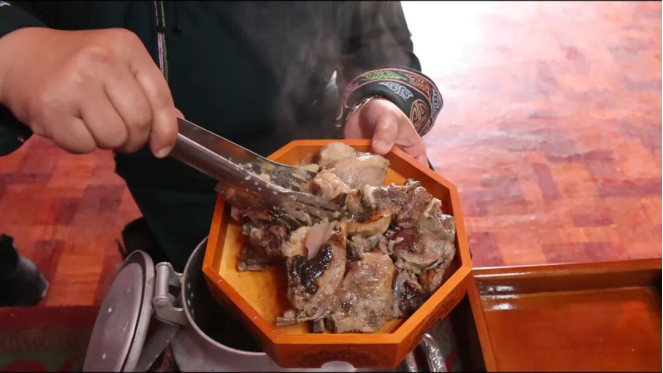 这道特色美食源自牧民传统游牧智慧。古时先民依托草原就地取材,将河谷鹅卵石烧至赤红,搭配草原鲜羊焖制而成,既是游牧生活中的特色美味,更是牧民顺应自然的饮食哲学,历经岁月传承至今。