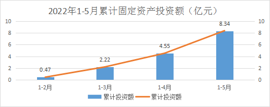 2022年1-5月在库项目78个,完成投资额8.34亿元,同比增长39.2%,增幅较1—4月年提高16.9个百分点。