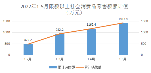 截至5月末温泉县限额以上社会消费品零售总额1417.4万元,同比增长16.4%,增幅较1—4月回落16.2个百分点。其中限额以上零售业完成额1184.4万元,同比增长9.2%,增幅较1—4月回落12.3个百分点,限额以上住宿餐饮业餐饮额完成额233万元,同比增长75.3%。增幅较1—4月回落48.8个百分点。