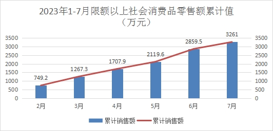 截止7月末,温泉县实现限额以上社会消费品零售总额3261万元,比上年同期增长25.1%,7月份当月实现社会消费品零售总额401.5万元。