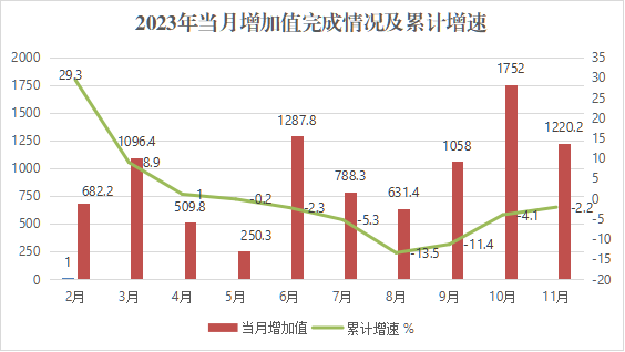 2023年1-11月,温泉县12家规模以上工业企业累计完成工业增加值9827万元,同比下降2.2%。11月当月开工10家,4家企业实现正增长,6家企业呈下降趋势,完成规模以上工业增加值1220.2万元,同比增长14.5%。