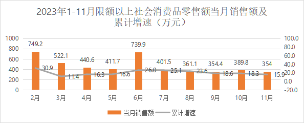 截止11月末,温泉县实现限额以上社会消费品零售总额4927万元,比上年同期增长15.9%,增速较1-10月回落2.4百分点,从月度看9、10、11月份当月实现社会消费品零售总额分别354万元、389万元、442万元。限额以上社消增长主要是靠餐饮业和住宿业的餐费收入拉动。