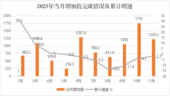 2023年1-11月,温泉县12家规模以上工业企业累计完成工业增加值9827万元,同比下降2.2%,降幅较1-10月收窄1.9个百分点。11月当月开工10家,4家企业实现正增长,6家企业呈下降趋势,完成规模以上工业增加值1220.2万元,同比增长14.5%。