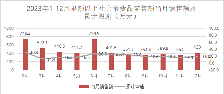 截止12月末,限上社会消费品零售总额完成5347.1万元,同比增长6.3%;其中:零售业零售额为4004万元,同比下降5.3%;住宿业的餐费收入营业额879.6万元,同比增115.2%;餐饮业营业额463.5万元,同比增长18.1%。