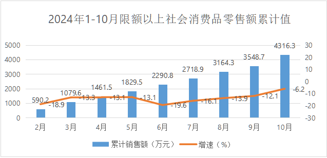 截至10月末,温泉县限额以上社会消费品零售总额4316.3万元,比上年同期下降6.2%,10月份当月实现社会消费品零售总额567.4万元。
