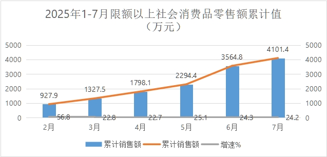 截至7月末,温泉县实现限额以上社会消费品零售总额4101.4万元,比上年同期增长24.2%,7月份当月实现社会消费品零售总额536.6万元。