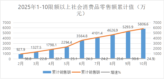 截至10月末,温泉县限额以上社会消费品零售总额5806.6万元,比上年同期增长24.9%,增幅较1—9月回落了5.7个百分点;其中:零售业商品销售额4541.3万元,同比增长33.0%;住宿业中餐费收入和商品营业额311.3万元,同比增长13.3%;餐饮业餐费营业额954万元,同比增长43.2%。