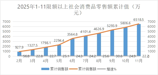 零售业销售大幅提升。截至11月末,零售业零售额5144.8万元,同比增长29.3%,较1-10月回落3.7个百分点。基本生活类消费成为消费品市场的重要支撑,限额以上单位粮油食品类、饮料类、烟酒类、服装鞋帽针纺织品类零售额同比分别增长27.6%、56.2%、21.3%、净增长,占限额以上消费品零售额的89.5%。