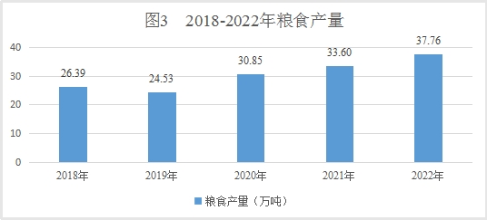 全年粮食产量37.82万吨,比上年增加4.28万吨,增长12%,其中:小麦产量2.51万吨、玉米产量35.25万吨、薯类产量0.05万吨、豆类产量0.0062万吨。油料产量0.08万吨,增长100%。甜菜产量3.06万吨,下降73%。蔬菜产量0.12万吨,增长120%。苜蓿产量0.24万吨,下降25%。其他作物产量9.05万吨,下降16%。