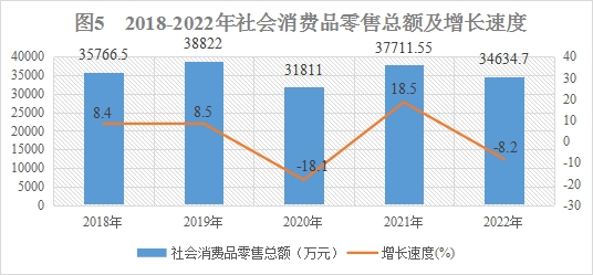 全年全社会消费品零售总额34634.7万元,同比下降8.2%。按经营地划分,城市消费品零售额28556.6万元,同比下降4.4 %;农村消费品零售额6078.1万元,同比下降10%。按行业划分,批发业商品销售额84263.3万元,增长18%;零售业商品销售额3685.3万元,增长24%;住宿业营业额1503.4万元,下降17.4 %,餐饮业实现营业额189.5万元,增长27.4%。