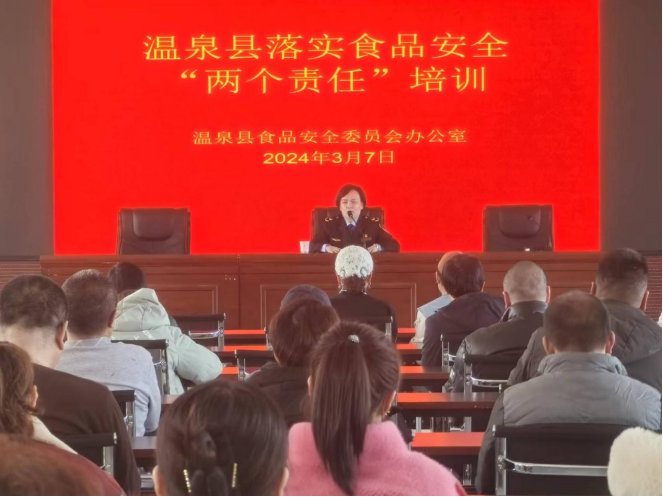 为进一步推进食品安全“两个责任”工作落地落实,切实帮助和指导包保干部在督导过程中明确重点、有的放矢,提升全县食品安全工作水平。近日,温泉县市场监督管理局赴各乡镇场,召集包保干部、包保主体及学校食品安全总监、食品安全员开展了为期4天共7场的食品安全“两个责任”培训,全县8个乡镇场126名包保干部439个包保主体和51名食品安全总监和安全员参加本轮培训。