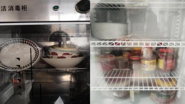 上榜理由:1、后堂垃圾桶非脚踩式;2、冷藏柜未除霜;3、冷藏柜内食品未分类摆放;4、消毒柜损坏不能正常使用。