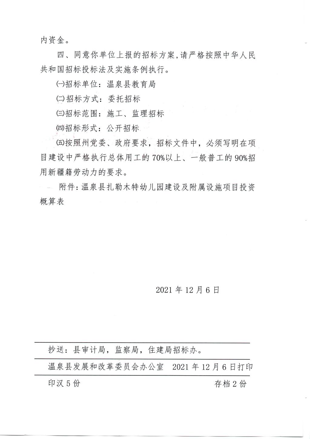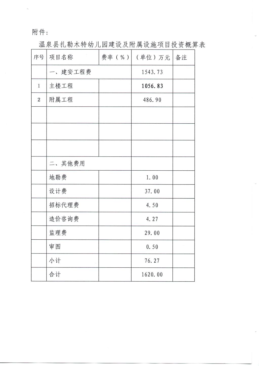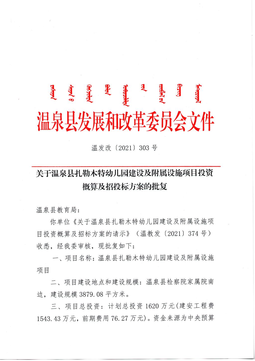 关于温泉县扎勒木特幼儿园建设及附属设施项目投资概算及招投标方案的批复