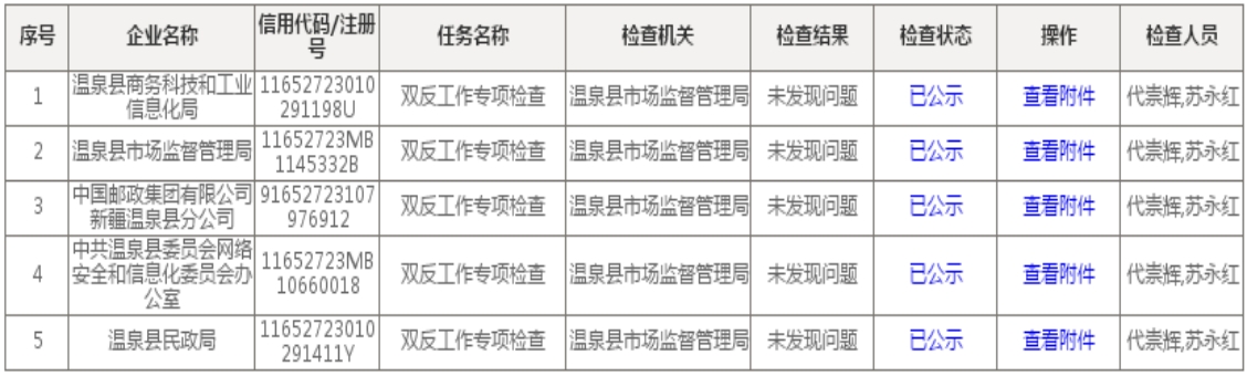 温泉县市场监督管理局关于双反工作双随机检查结果公示