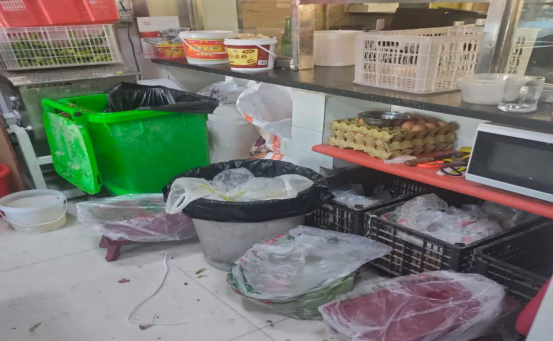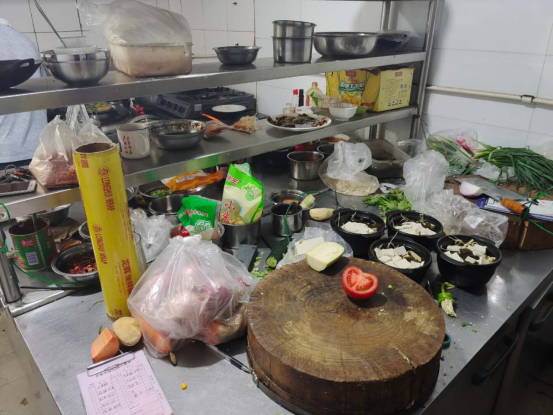 上榜理由:后堂卫生脏乱差;食品摆放混乱,生熟未分开;索票索证记录不全。