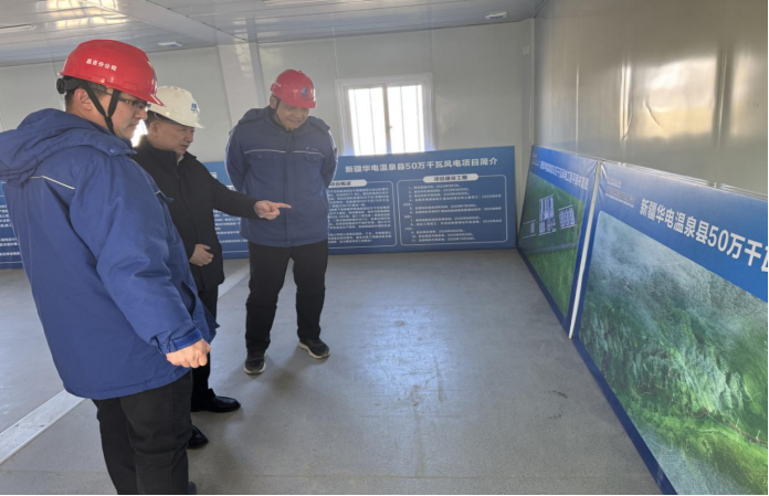 督导组先座谈听取项目开复工情况汇报,并查阅项目档案资料。随后,督导组一行先后深入华电温泉县50万千瓦风电项目、新疆温泉通用机场建设项目等项目实地调研,并详细了解工程进度、施工安全管理情况。