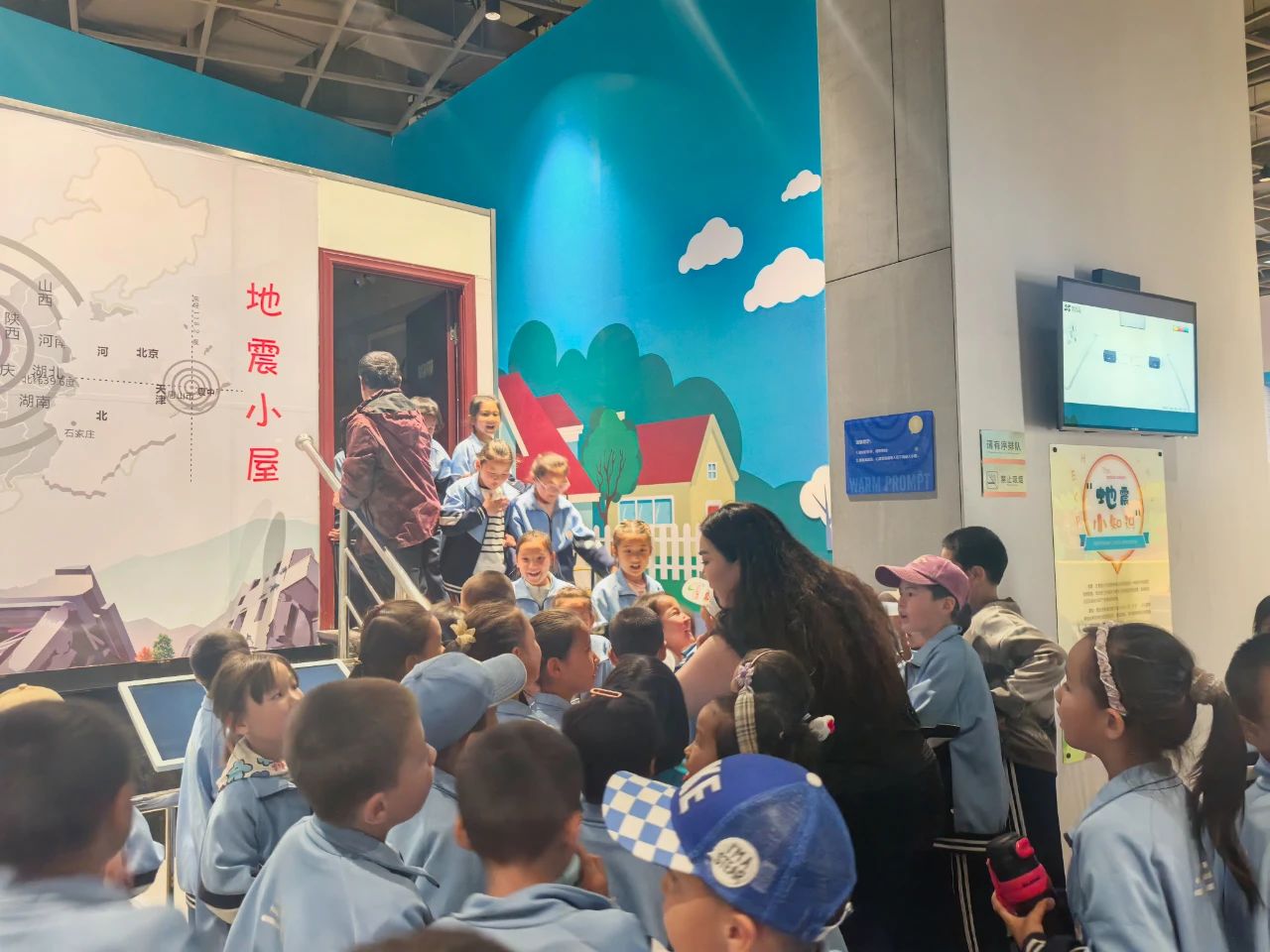 学生们在老师的带领下有序进入科技馆。在地震模拟体验区,孩子们通过"地震小屋"切身感受不同震级的地震波动,学习防震减灾知识。一年级三班的学生莱乌然奋地说:"原来地震时是这样的感觉,我都紧张的不行了,心里怦怦乱跳,到处都是晃动的,墙上的勺子和铲子发出叮当的碰撞声,在学习中我学会了首先抱着头立即躲到坚固的桌子下面。"这种体验式教学让抽象的科学知识变得生动可感,增强了孩子们的地震安全意识。
