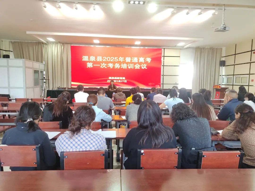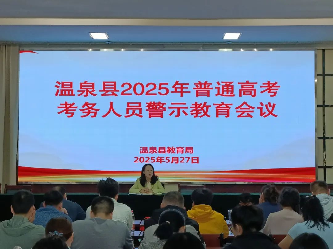 高考关乎万千学子的未来,为全力护航 2025 年高考平稳有序,5 月 27 日上午,温泉县教育局迅速行动,以 “强能力、转作风、保平安” 为目标,组织 56 名高考考务人员开展警示教育、首次考务培训及业务测试,全力锻造一支专业可靠的高考 “护航队”。