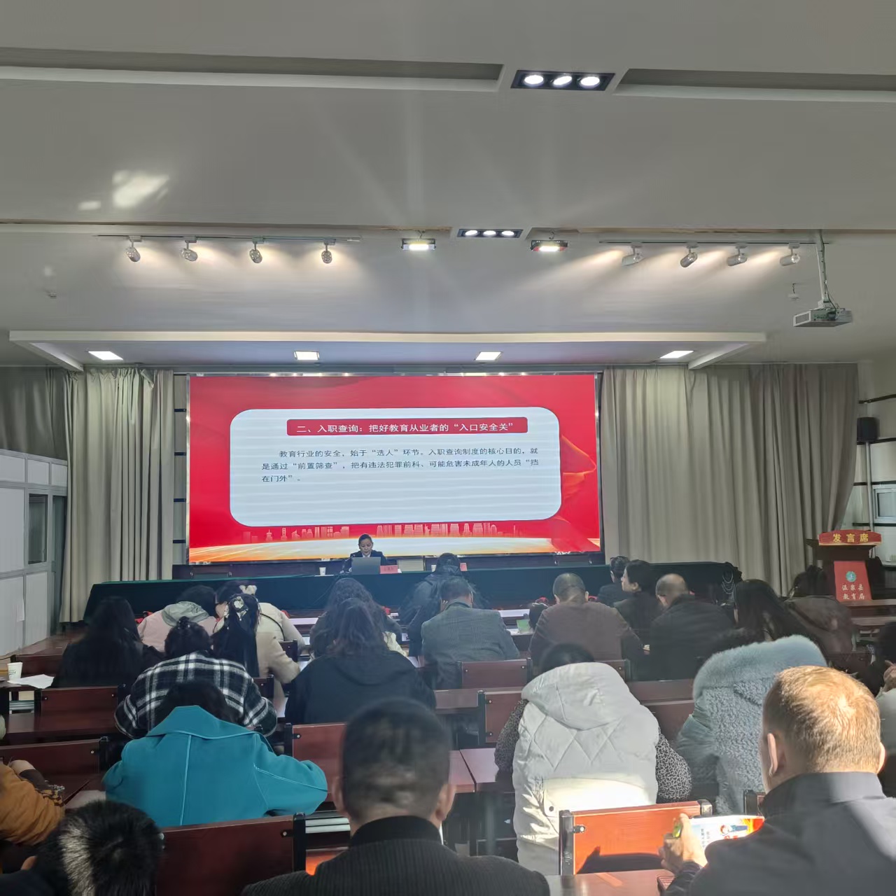 为深入落实《侵害未成年人强制报告制度》《入职查询制度》等法规,切实提升教育系统教职工法治意识与责任担当,10 月 24 日,温泉县教育局联合县人民检察院,共同开展 “守责・知法・严准入 强制报告、入职查询、酒驾防范” 专题法治讲座。讲座全程以 “法规解读 + 案例剖析” 为核心形式,将专业法律知识转化为贴合教育工作实际的实用内容,让参会教职工听得懂、用得上。