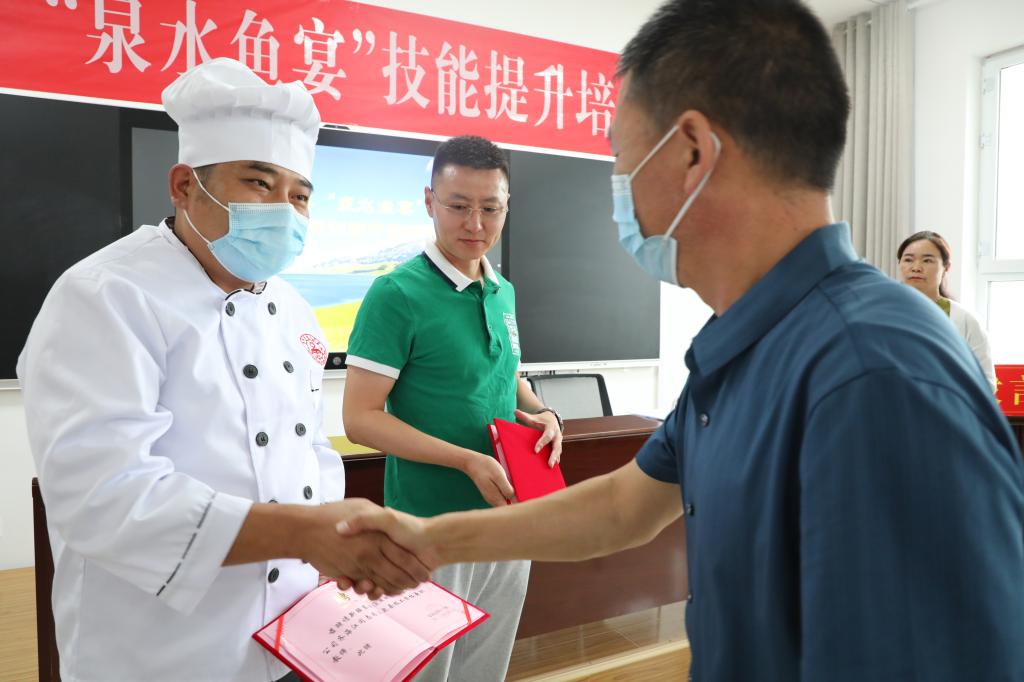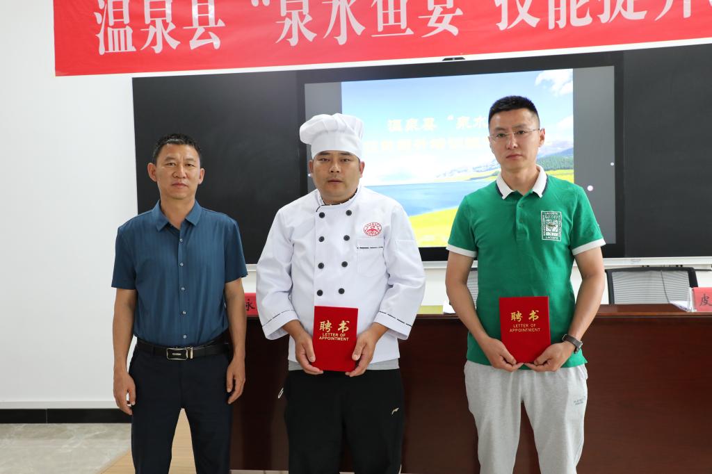 7月7日下午,温泉县“泉水鱼宴”技能提升培训班开班典礼在温泉县技工学校举行,新疆赛湖渔业科技开发有限公司副总经理潘永广同志出席典礼。开班典礼中,县党委组织部副部长、人力资源和社会保障局党组副书记、局长肖俊扬同志为冷水鱼烹饪授课教师潘永广、齐海江颁发聘用证书。