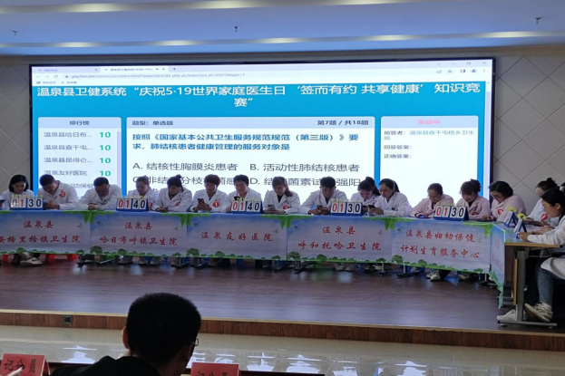 2023年5月19日是第13个“世界家庭医生日”,为进一步扩大宣传覆盖面,推进家庭医生签约服务高质量发展,提高签约居民获得感、满意度。5月17日下午,温泉县卫健委举办卫健系统“5·19世界家庭医生日‘签而有约,共享健康’”知识竞赛活动。温泉县卫健委党组书记、副主任丁萍、州卫健委基层卫生办王峰、县卫健委班子成员及各级医疗卫生机构9支代表队27名家庭医生参加此次活动。