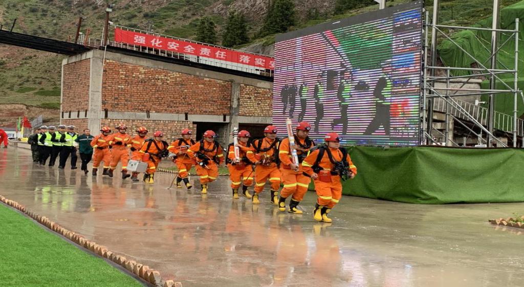 当天上午11点20分,演练正式开始。现场模拟温泉县北达巴特铜矿在组织生产中,因地下局部不稳定岩层突然发生坍塌,两名作业工人被困地下。事故发生后,企业立即启动生产安全事故应急救援预案,迅速集结矿山应急小分队开展自救,同时在第一时间向120急救中心、属地政府、县公安局、县应急管理局报告。相关部门及时赶赴事故现场,在现场指挥部的统一指挥下,迅速高效处置险情,开展事故现场救护、安全警戒工作。整个演练过程,组织严密有序,队伍精神饱满,协调配合顺畅,应急救援迅速,事故处置有力。