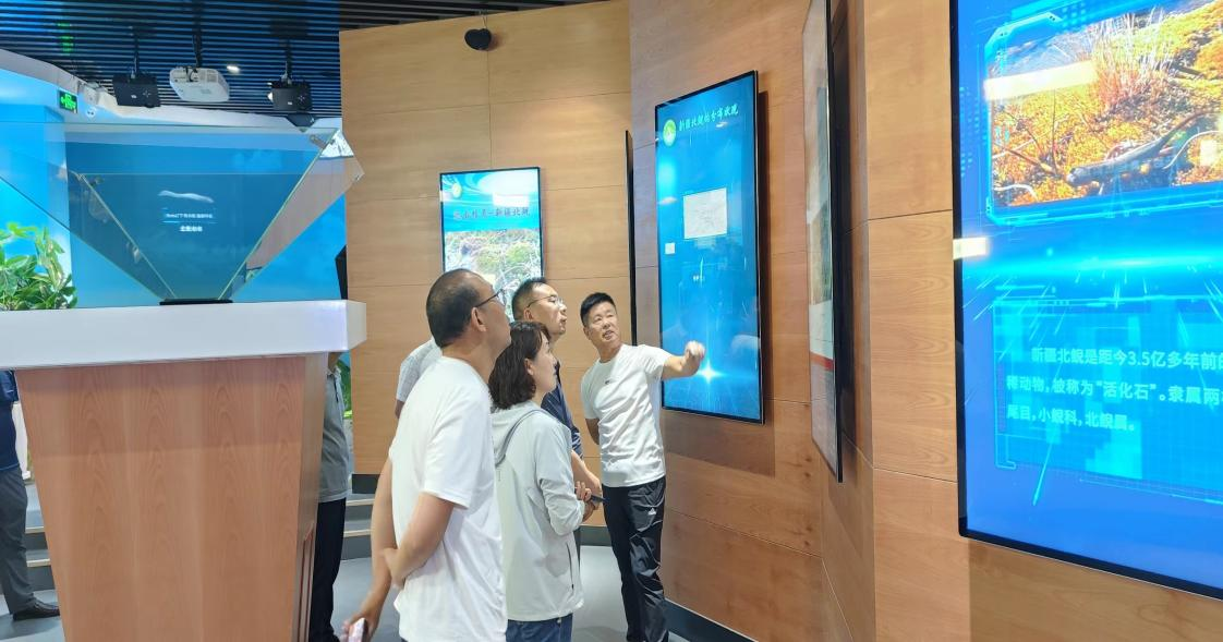 新疆北鲵自然保护区管理站四级调研员纪晓伟带领新疆天山西部国有林管理局一行人员参观北鲵人工孵化展示室