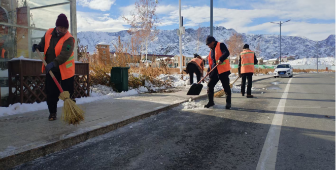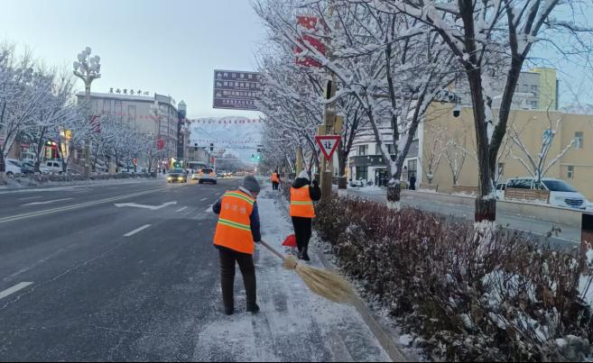 降雪过后,园林环卫服务中心、深圳市保洁恒环境产业有限公司博州分公司并未松懈,持续发力做好后续保障:每日组织环卫工人对无人区域、角落缝隙等易被忽视的薄弱部位进行拉网式清理;每晚安排全体作业人员加班至23时,同步开展积雪清运和路面结冰铲除作业,全方位消除低温天气带来的道路安全隐患。