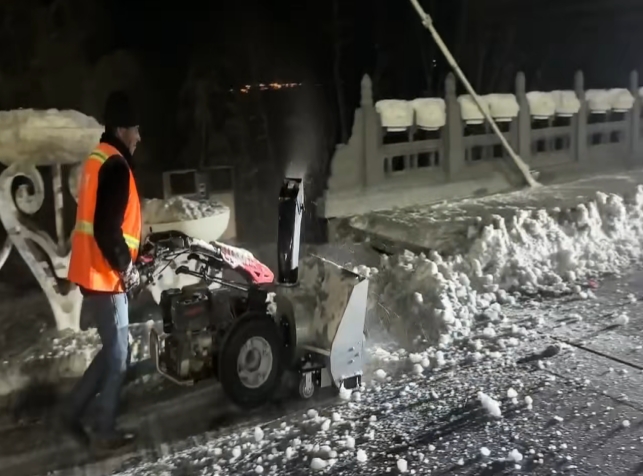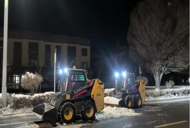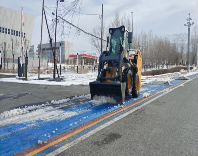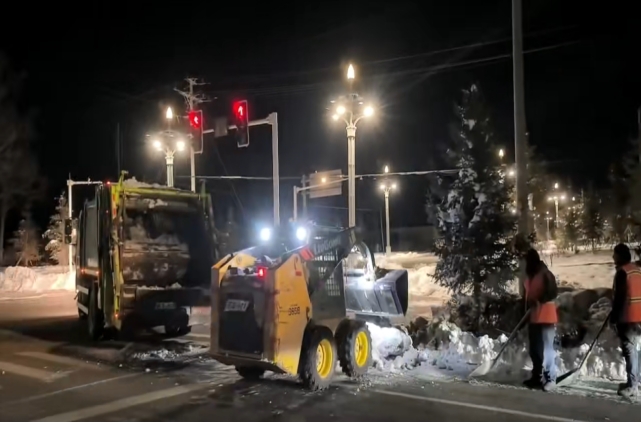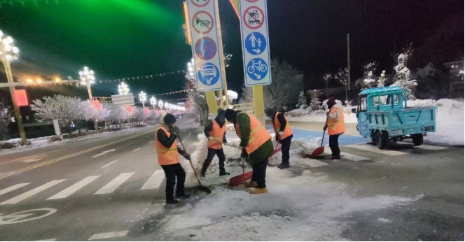 为高效推进除雪工作,园林环卫服务中心、深圳市保洁恒环境产业有限公司博州分公司统筹调配人力物力,共组织115名环卫工人,调配大型扫雪车6辆、凯斯车5台、大铲车1辆,形成“人机协同、高效联动”的作业模式,不畏严寒、坚守一线,通宵奋战至次日6时,重点对县城公共区域主次干道、人行道等核心通行路段进行集中清雪,确保积雪“即下即清、雪停路通”,全力保障主要交通线路畅通。