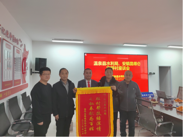 2月1日,温泉县安格里格村昆得仑布呼村两委班子一行4人,代表全村百姓为温泉县水利局送上题有“驻村帮扶结深情,无私帮扶为百姓”的锦旗,对水利局派驻在昆得仑布呼村的“访惠聚”工作队办的实事好事表示感谢。