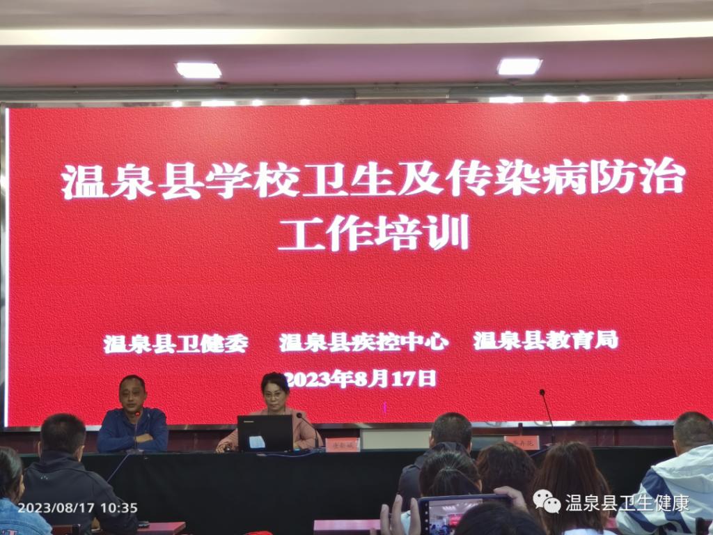 为进一步做好全县学校及幼儿园传染病防控及学校卫生工作,提高学校传染病预防控制和应急处置能力。8月17日,温泉县卫健委联合县教育局,组织疾控中心召开2023年学校传染病防控及学校卫生工作培训会议,各大中小学和幼儿园分管领导及保健医共40余人参加培训会议。