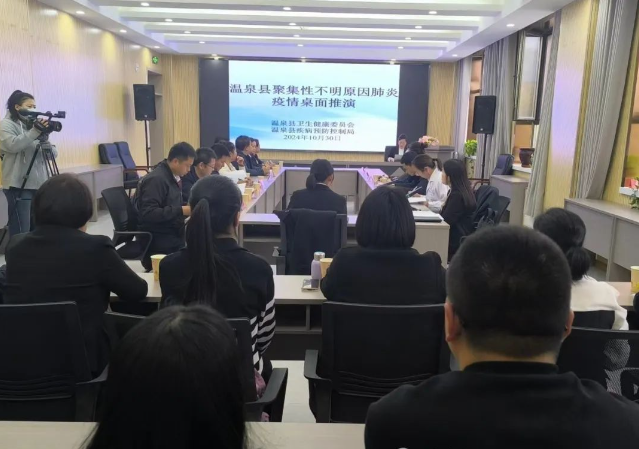 10月30日,在温泉县妇幼保健计划生育服务中心三楼会议室,由县卫生健康委员会、县疾病预防控制局联合组织开展2024年温泉县聚集性不明原因肺炎疫情桌面演练,旨在提升我县应对突发公共卫生事件的能力,强化各部门之间的协作与配合,有效应对突发公共卫生事件。县委宣传部、公安局、教育局、文旅局等相关部门及各医疗机构共20余人参加演练。