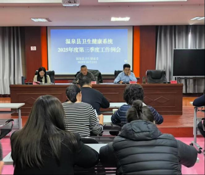 2025年10月23日上午,全县卫生健康系统在县卫健委会议室召开第三季度工作例会,深入学习贯彻习近平总书记在庆祝中华人民共和国成立76周年招待会上的重要讲话精神及听取新疆工作汇报时的重要指示精神,总结三季度工作,分析短板,部署四季度重点任务,冲刺全年目标。各县级医疗机构、乡镇卫生院院长及委机关相关科室负责人参会。