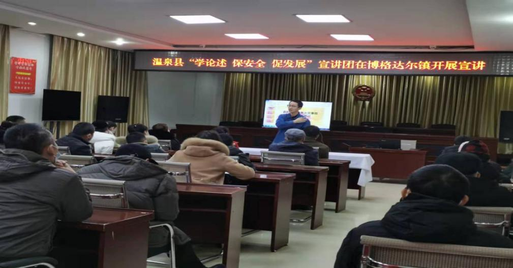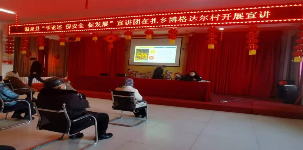 为深入贯彻落实习近平总书记关于安全生产、应急管理和防灾减灾工作重要论述精神,全面强化落实安全生产责任,提升全民安全意识,切实增强从根本上消除事故隐患的思想自觉和行动自觉。通过前期精心准备,制定下发《温泉县2022年“学论述 保安全 促发展”大宣讲活动实施方案》开展安全生产宣讲活动。由县应急管理局牵头并组织县农业农村局、畜牧兽医局、交通运输局、公安局、消防救援大队、供电公司、气象局等9个单位,在8个乡镇场、73个村队、5个社区、47家企业进行为期8天的安全生产大宣讲活动。