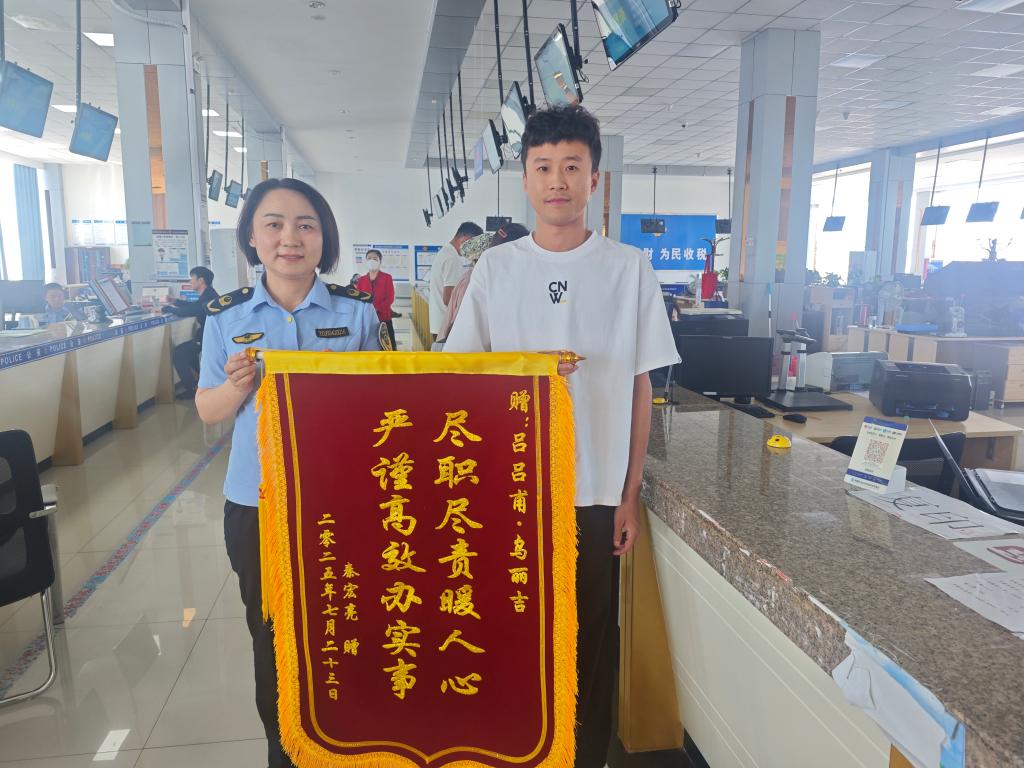 7 月 23 日,温泉县盛悦机械租赁有限公司财务负责人秦先生专程来到县行政服务中心市监局窗口,将一面印有 “严谨高效办实事 尽职尽责暖人心” 的锦旗送到工作人员乌丽吉手中,感谢其高效优质的服务,助力公司顺利完成 “个体工商户转型升级为企业”(简称 “个转企”)手续。