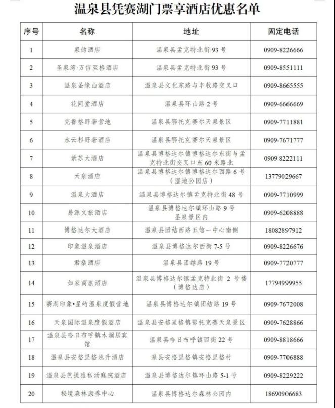 凭赛里木湖景区门票,前往温泉县旅游的游客,72小时内,在温泉县指定酒店有实际住宿消费(名单见附件),可享受门市价抵扣50元,同一间房不可叠加使用。