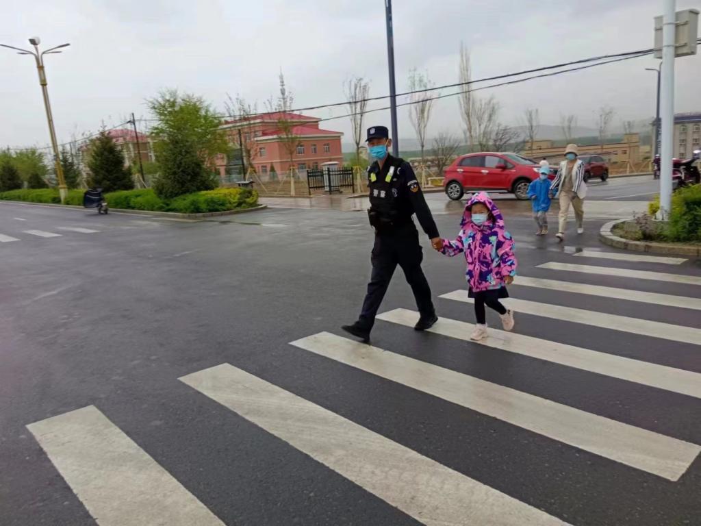 初级中学附近,民警在护学岗过程中,发现一名儿童独自徘徊在十字路口,过路车辆较多,为避免意外发生,民警将孩子引导致安全地带。