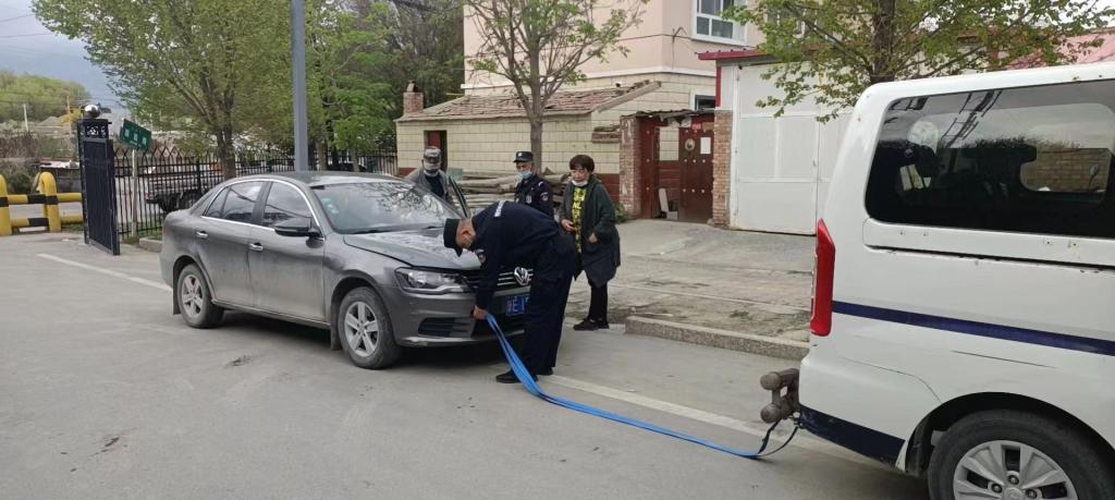 民警在巡逻过程中发现,一辆私家车长时间停靠在路边,车主急忙前来求助,经了解车辆由于馈电无法启动,随后民警立即用拖车绳将私家车拖到汽车修理库,车主对民警的热心帮助表示非常感谢。