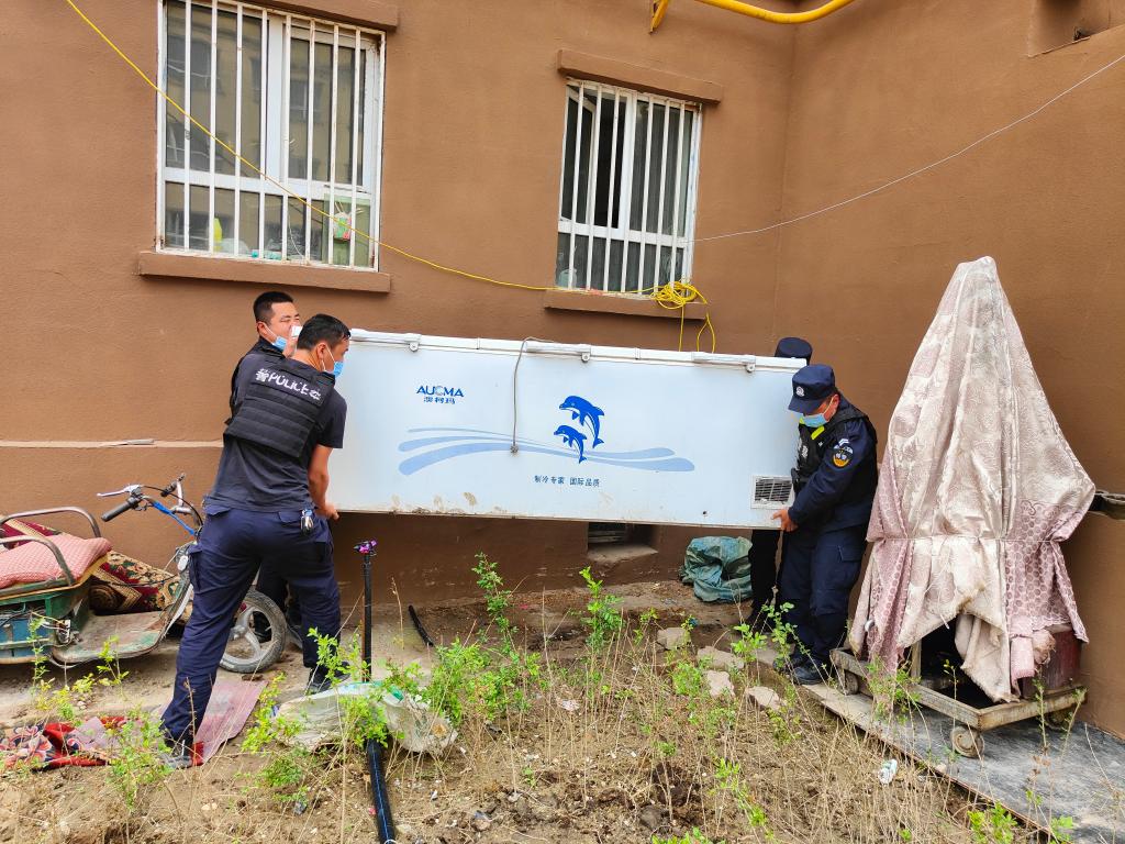 5月25日,民警接到辖区卡先生的求助电话,由于放在室外的冰柜被绿化带喷头淋湿,导致冰柜里面结冰,希望民警能帮忙把冰柜搬入地下室。民警到达现场后发现,卡先生正坐在路旁座椅上,身旁放着拐杖,因为身体原因,行动不便。4位民警分别一人抬起一个角,用尽全身的力气将大冰箱抬入地下室,群众卡先生高兴地向民警表示感谢“还好有你们”。