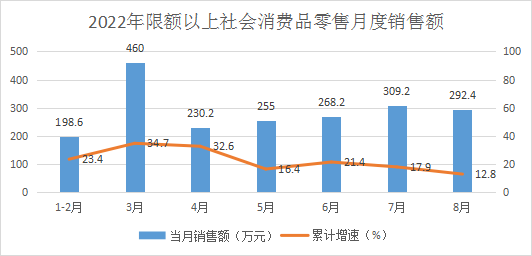 ㈡ 零售市场增长势头企稳。随着促消费政策不断优化销售模式和提升服务水平,对消费者的吸引力不断增强,今年1-8月限额以上零售业实现销售额1854.5万元,同比增长12.9%,增幅较1—7月提高2.5个百分点。