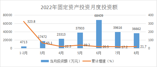 1—8月有投资进度的项目81个,完成投资22.82亿元,同比增长21.7%,其中:形象进度法有投资进度的18个,完成投资14.5亿元,占比63.5%;财务支出法有投资进度的项目63个,完成投资8.32亿元,投资占比36.5%。1—8月新入库项目43个,比上年同期少8个。