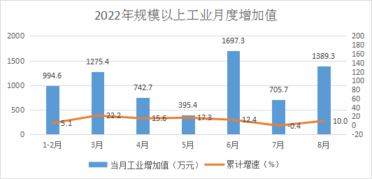 从增加值完成情况看:2022年6月完成情况最好,完成工业增加值1697.3万元;完成情况最差的是2022年5月,仅为395.4万元。