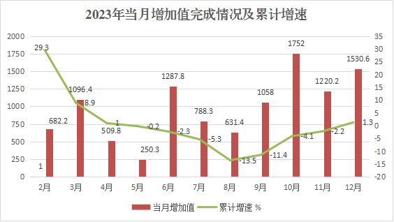 2023年全年温泉县12家规模以上工业企业累计完成工业增加值1.14亿元,同比增长1.3%。12月当月开工8家,完成规模以上工业增加值1530.6万元,同比增长32.7%。