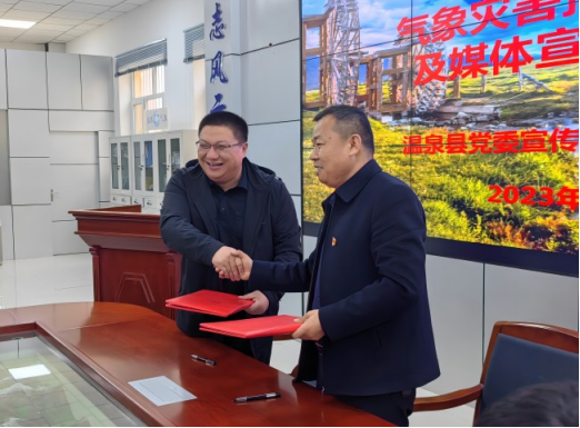 3月9日,党委宣传部部长王子飞,气象局局长张海军代表双方签订《温泉县党委宣传部与温泉县气象局气象灾害预警发布及宣传共建协议书》。