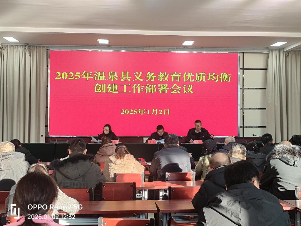 1月2日,2025年温泉县教育局召开义务教育优质均衡创建工作部署会议,班子成员、各指标负责人参加会议。县委教育工委常务副书记、教育局党组书记、副局长何飞作动员讲话,会议由教育局党组副书记、局长肖贵芳主持。