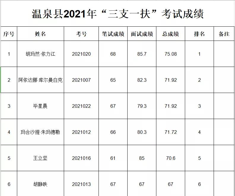根据《2021年温泉县三支一扶高校毕业生招募方案》的安排,我县2021年“三支一扶”招募考试笔试、面试已结束。现将21名考生成绩予以公示,公示时间为2021年9月10日至9月12日,共3天。