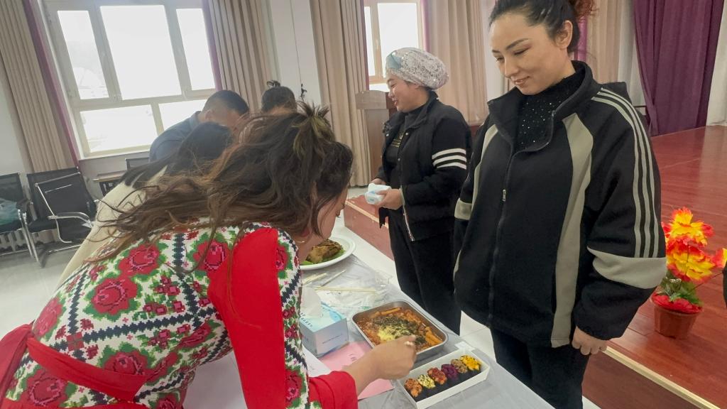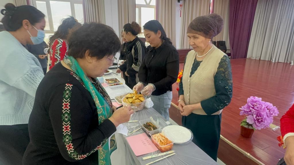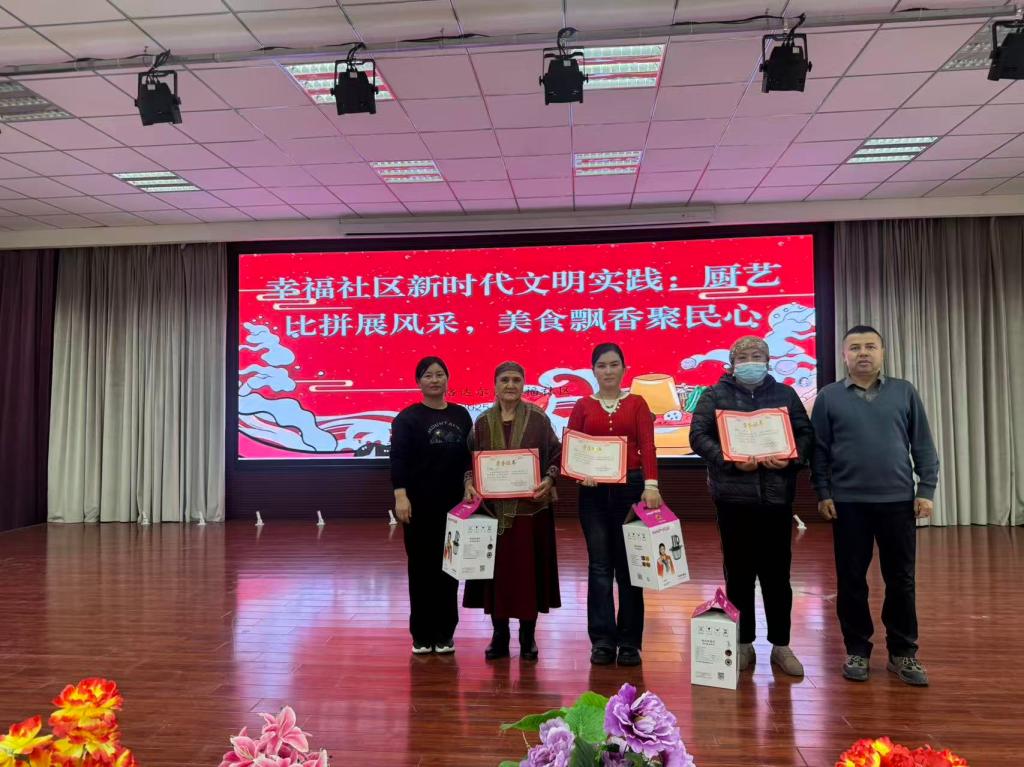比赛当天,社区活动中心热闹非凡。参赛居民提前备齐食材放在桌上,菜品有冯米乃(羊头)、再吐娜木(韩式辣年糕,寿司)、买地娜(烤包子)、麦然古丽(凉菜)、阿里木餐厅(炒面)、蒙克塔餐厅(蒙古面条)、天然居民宿(辣子鸡)、肉馕等,选手们依次介绍菜品的创意理念与制作心得,评委团从“色、香、味、形、意”五个维度打分,同时设置“最佳人气奖”,由评委和现场的居民选出。最终,羊头、烤包子、蒙古面条等8道菜品分别斩获一、二、三等奖及特色奖项。颁奖环节,社区工作人员为获奖选手送上厨具礼盒与荣誉证书,现场掌声不断。