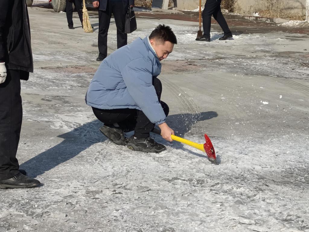 这次的劳动主要是针对办公楼后面的卫生清理。大家有的拿铁锹,有的拿扫把,有的带推雪板,大家的“武器装备”很齐全,院内的积雪和冰堆是主要的清除对象。在劳动现场,铁锹撞击冰面的声音此起彼伏,像一首美丽的乐曲从四面八方传来。人多力量大,冰堆再难除,也抵挡不住大家干活的热情,一下、两下、三下......随着“功夫”的加深,地面上也都变成了一层层的碎冰,这时用扫把扫成堆,再用推雪板推走,地面就变得十分的干净了。